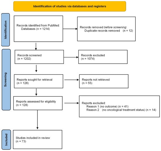 The search included terms related to oncology, critical care, and outcomes, using variations of “cancer,” “ICU,” and “prognosis”. Filters were applied to select studies involving adult humans (≥19 years), published in English, and available in full text. The eligible article types included observational studies, clinical trials, and reviews, with preprints excluded. Additionally, reference lists of key articles and previous reviews were manually checked to find studies not identified through the database search.