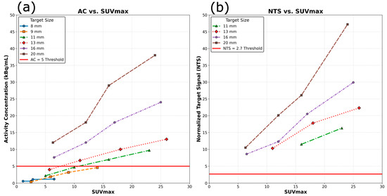 Relationship between SUVmax and AC and NTS for targets of different sizes. (a) shows the activity Concentration (AC) versus SUVmax for different target sizes. The critical AC > 5 kBq/mL threshold required for successful BgRT planning is shown in red. Smaller targets require disproportionately higher SUVmax values to achieve sufficient AC. (b) depicts the Normalized Target Signal (NTS) versus SUVmax demonstrating a linear relationship across all target sizes. The NTS threshold is shown in red (NTS = 2.7). The NTS is dependent on the AC, and if AC < 5 kBq/mL is detected, the NTS is not calculated by the RefleXion system.