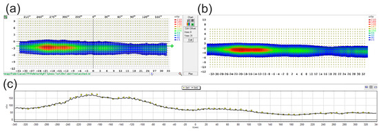 Treatment delivery verification. (a,b) ArcCheck measured distribution for the 11 mm target shown on the left, with the reference TPS distribution on the right for the 20:1 target-to-background ratio. The gamma passing rate for this delivery was 91.6% for 3%/2 mm and 97.7% for 3%/3 mm. Line profile across the green horizontal line in (a,b) is shown in (c).