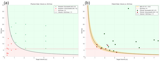 Our findings above demonstrate that the SUVmax threshold required for successful BgRT planning is significantly dependent on target size or volume, with an inverse relationship between these parameters as shown in Section 3.1. This observation led us to investigate whether diagnostic PET-CT data could be used to prospectively identify suitable BgRT candidates prior to treatment planning. Analysis of successful plans revealed a consistent relationship between target volume, SUVmax, and planning success. Product of PET-avid target volume (cc) and SUVmax greater than 11 consistently predicted successful BgRT planning across all target sizes used in the phantom study. This criterion accurately classified all 24 experimental conditions in our phantom study, as illustrated in Figure 4a, which plots the SUVmax × Volume relationship against our experimental data points. While a diameter-based metric can be derived (as discussed later in the discussion section), volume was selected for the predictive model for several reasons. First, PET signal generation and AC calculation fundamentally depend on radiotracer accumulation throughout the entire three-dimensional tumor volume, not just linear dimensions. Second, although our phantom study utilized spherical targets for controlled evaluation, clinical lesions can be irregular in shape. For such non-spherical targets, volume measurement captures the true extent of radiotracer distribution more accurately than any single linear dimension.