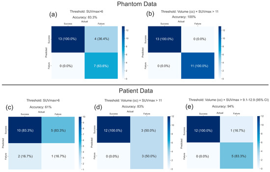 Error/Confusion matrices comparing PET-based detection criteria for both phantom and patient data. The matrices illustrate the predictive performance of two detection criteria: the current SUVmax > 6 threshold and the new proposed Volume × SUVmax > 11 threshold for both the phantom and the patient dataset. In (a), error matrix for the phantom dataset using the current recommended threshold is shown. An accuracy of 83.3% was achieved, however using the new volume-scaled SUVmax metric proposed in this study, the accuracy increased to 100% (b), (c–e) show the error matrices for the patient dataset. Using the current recommendation of SUVmax > 6, an accuracy of 61% was achieved. However, this increased to 83% when using the new proposed threshold (d). (e) shows the error matrix if all points falling within 95% CI were to be counted as correctly classified. In that case, the classifying accuracy increases to 94%.
