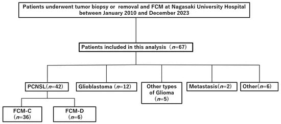 Between January 2010 and December 2023, 67 patients with suspected PCNSL underwent biopsy or tumor removal with intraoperative FCM. Histopathological evaluation confirmed PCNSL in 42 patients, while 25 were diagnosed with other conditions: glioblastoma (n = 12), other gliomas (n = 5), metastases (n = 2), and miscellaneous tumors, including meningioma or inflammatory lesions (n = 6) (Figure 1). All confirmed PCNSL cases were classified as DLBCL.