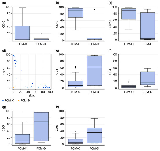 Lymphocyte subset analysis (a–c,e–h) and scatter plots (d) determined by FCM. Percentages of B-cell surface markers (a–c). Scatter plot of slgκ and slgλ (d). Percentages of T-cell surface markers (e–h). Abbreviations: FCM-C, flow cytometry concordant; FCM-D, flow cytometry discordant; slgκ, surface immunoglobulin κ; slgλ, surface immunoglobulin λ.