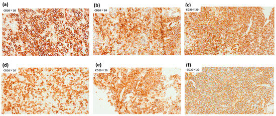 Percentage of intratumoral CD20-positive lymphocytes in FCM-D cases. Percentages of intratumoral CD20-positive lymphocytes were 79% (a), 83% (b), 93% (c), 72% in (d), 87% (e), and 98% (f), with a median of 85% (range 72–98%). Abbreviations: FCM-D, FCM discordant.
