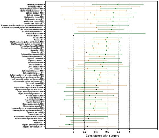 Consistency between preoperative MRI/CT tumor burden and intraoperative observations at different metastatic sites. The green line represents the MRI results and the brown line represents the CT results. Circular markers indicate statistical significance (p < 0.05), while “×” markers indicate no statistical significance (p > 0.05). Markers represent Cohen’s weighted kappa value, and the horizontal whiskers represent the 95% confidence. Low-consistency ranges: 0.2–0.4; Medium consistency ranges: 0.4–0.6; High-consistency ranges: 0.6–1.