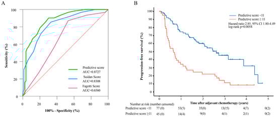 The performance of the tumor burden-integrated predictive score (A) ROC curves were generated to evaluate the performance of different models in predicting surgical outcomes. (B) Progression-free survival of patients grouped by tumor burden-integrated predictive score.