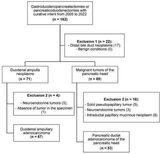 We screened 162 consecutive patients considered for curative resection and obtained a final cohort of 120 after applying eligibility criteria (Figure 1). Inclusion criteria: ductal adenocarcinoma of the pancreatic head and ampullary adenocarcinoma treated with pancreaticoduodenectomy. Exclusion criteria: distal common bile duct or duodenal primary tumors; benign conditions; non-ductal pancreatic neoplasms (e.g., solid pseudopapillary tumor, neuroendocrine tumors, intraductal papillary mucinous neoplasm); and non-adenocarcinoma papillary tumors. Adjuvant chemotherapy was indicated and managed by the institutional Medical Oncology Service according to prevailing protocols during the study period.