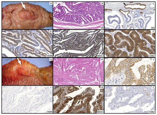 (A–F). Intestinal type: (A) Polypoid Vater’s ampulla tumor (White arrow). (B) Microscopy—Hematoxylin and Eosin (H&E) staining: irregular gland-forming adenocarcinoma composed of elongated cells with stratified nuclei and scattered goblet cells. Immunohistochemical profile: CK7 negative, black arrow shows CK7 positive control cells of peribiliary glands (C); CK20 (D), MUC2 (E), and CDX2 (F) positive. (G–L). Pancreatobiliary type: (G) Polypoid and eroded tumor of Vater’s ampulla (white arrow). (H) Microscopy—Hematoxylin and Eosin (H&E) staining: irregularly infiltrating glands with pale cytoplasm. Immunohistochemical profile: CK7 positive (I); CK20 negative (J), MUC1 positive (K), and CDX2 negative (L).