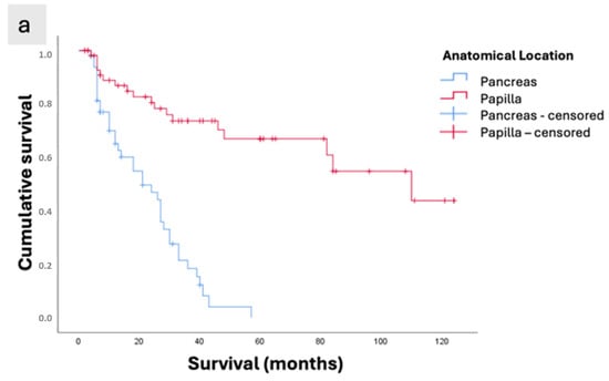 Both the anatomical location (papilla and pancreas) and the morphological classification (intestinal, pancreatobiliary, and pancreatic) were factors that impacted survival according to the univariate analysis (p < 0.001). The papilla group had a mean survival of 83.7 months, whereas the pancreas group showed a survival of 22.7 months (Figure 3a).