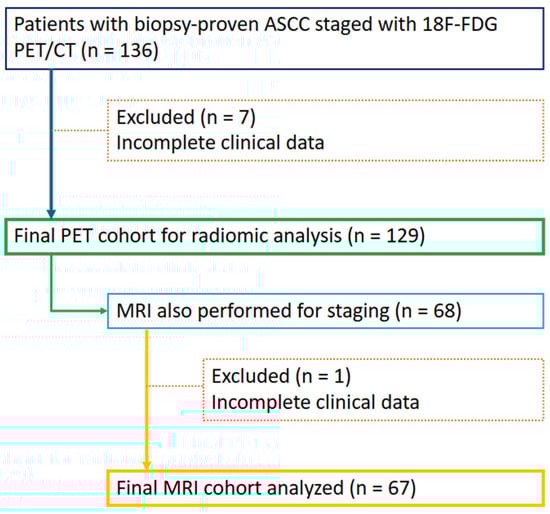 Patients were retrospectively identified through the institutional Radiology Information System search engine and an existing provincial registry database of 18F-FDG PET/CT scans. A total of 129 patients aged ≥ 18 years with biopsy-confirmed ASCC who underwent 18F-FDG PET/CT for staging were included in this study, spanning an 11-year period from 1 January 2012 to 31 January 2023. Of these, 67 patients who had staging MRI at the same time were analyzed. Patients with incomplete datasets and with other tumor histologies (e.g., adenocarcinoma or adenosquamous carcinoma) were excluded (Figure 1). All patients underwent standard therapy consisting of CRT as per published clinical guidelines [,,]. It should be noted that these patients are part of a larger cohort that was previously analyzed to assess the role of FDG PET/CT in the initial staging of ASCC [].