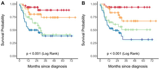 Kaplan–Meier curves of progression-free survival by quartiles of the radiomic score derived from a single feature (A) or two features (B). Each color represents a specific quartile of the radiomic score: Q1 = red; Q2 = orange; Q3 = green; Q4 = blue.