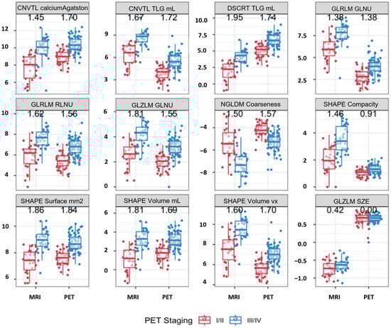 Comparison of radiomic feature values between early-stage (AJCC v9 stage I/II, red) and advanced-stage (AJCC v9 stage III/IV, blue) anal squamous cell carcinoma, measured on both MRI and PET for each feature. The numbers shown above each panel correspond to the Cohen’s d effect sizes for MRI (left) and PET (right), indicating the magnitude of difference between early- and advanced-stage groups. Larger absolute values denote stronger discrimination between staging groups. CNVTL = conventional; DSCRT = discretized; GLRLM = gray-level run length matrix; GLNU = gray-level non-uniformity; RLNU = run length non-uniformity; NGLDM = neighborhood gray-level difference matrix; GLZLM = gray-level zone length matrix; SZE = short-zone emphasis; TLG = total lesion glycolysis; SHAPE = shape feature.