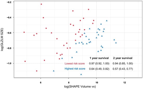 Scatter plot illustrating the relationship between the two MRI-derived radiomic features—SHAPE_Volume(vx) and GLZLM_SZE—used in the multivariable Cox model for progression-free survival. Each point represents an individual tumor, color-coded according to radiomic risk group (red = lowest risk score; blue = highest risk score). The inset table summarizes 1-, and 2-year progression-free survival probabilities (95% confidence intervals) for each risk group, demonstrating the prognostic discrimination achieved by the model.
