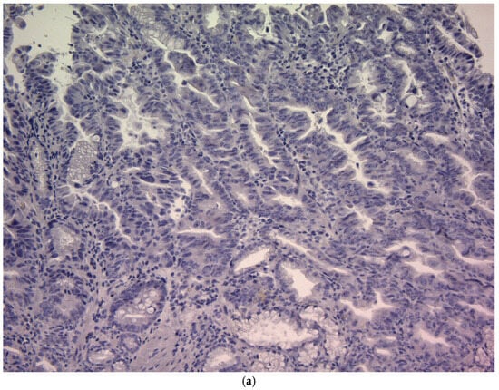 CD44v9 expression was evaluated by immunohistochemistry (IHC) using pretreatment endoscopic biopsy specimens. Biopsy tissue blocks that were fixed in formalin and embedded in paraffin were sliced into 2 μm thick sections, deparaffinized using xylene, and rehydrated through a series of ethanol solutions of increasing concentration. To reveal antigenic epitopes, the sections underwent antigen retrieval by autoclaving at 121 °C for 15 min. To prevent non-specific binding, the sections were treated with a diluted skim milk solution for 30 min at room temperature. Subsequently, they were exposed to a primary monoclonal antibody targeting CD44v9, which was developed in our laboratory, for 1 h at room temperature []. The antibody was diluted to approximately 0.1 μg/mL (~1:100) using an antibody-diluent (Thermo Fisher Scientific (Waltham, MA, USA)). After three washes with Tris-buffered saline (TBS), a secondary antibody was applied using the Histofine Simple Stain MAX PO detection system (Nichirei Biosciences Inc., Tokyo, Japan) for 30 min at room temperature. Subsequently, the sections were washed again with TBS, and the chromogenic reaction was developed using the Histofine DAB substrate kit (Nichirei Biosciences Inc.) for 4 min to visualize CD44v9 expression. Finally, the sections were counterstained with hematoxylin to stain the nuclei. Known CD44v9-positive gastric carcinoma tissues were used as positive controls, and staining with an isotype-matched irrelevant antibody was used as a negative control. Semi-quantitative scoring of CD44v9 immunoreactivity was performed by assessing the membranous staining intensity using a 0–3+ scoring system adapted from previously published criteria originally developed for CD44 IHC []. The intensity-based scoring guidelines were as follows: score 0 was assigned if there was negative or only weak membranous staining in <10% of tumor cells; score 1+, weak membranous staining in ≥10% of tumor cells or moderate intensity staining in <10% of cells; score 2+, moderate staining in ≥10% of tumor cells or strong (intense) staining in <10% of cells; and score 3+, intense membranous staining was observed in ≥10% of tumor cells (Figure 1). For each case, a consensus score (0, 1+, 2+, or 3+) was determined after reviewing any inter-observer differences (Figure 1). For analysis, CD44v9 expression was further categorized into low and high expressors: low CD44v9 expression was defined as an IHC score of 0, 1+, or 2+, whereas high CD44v9 expression was defined as a score of 3+. The evaluation of expression was conducted independently by two authors (K.S. and K.K.) under a blinded protocol, with the observers being unaware of the clinical outcomes and all other clinicopathological parameters of the patients.