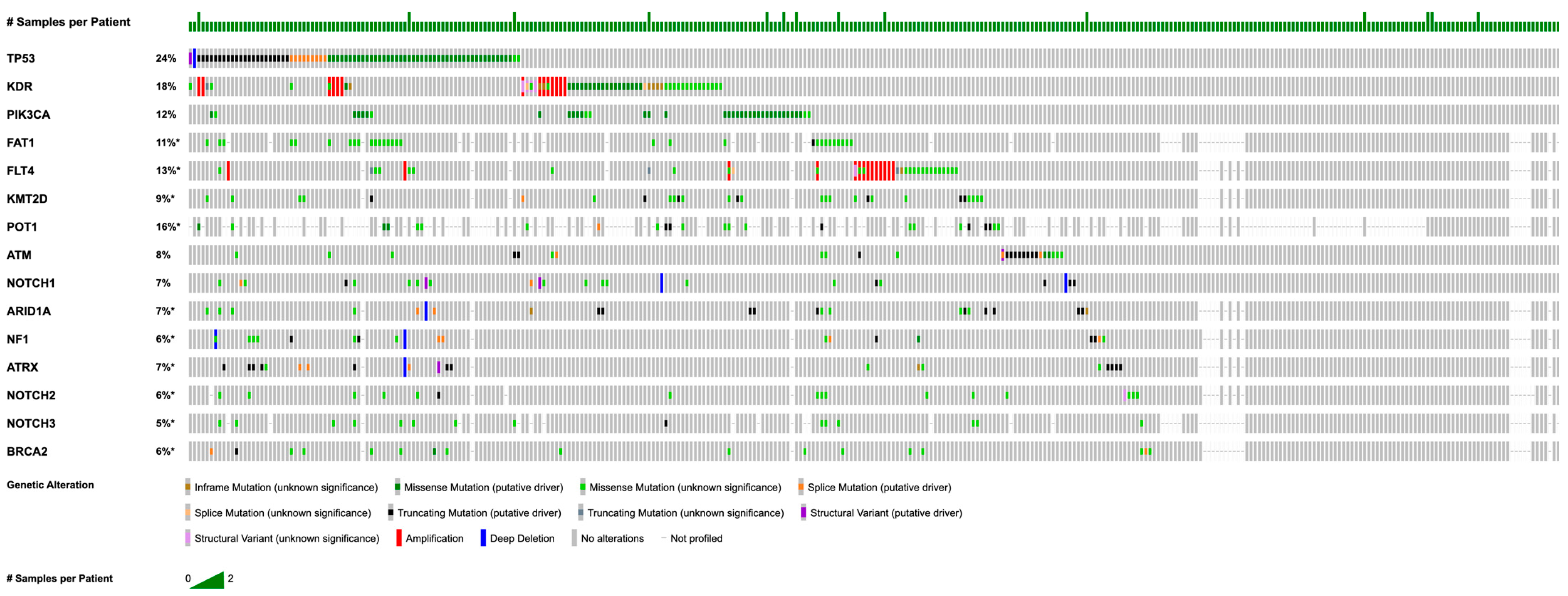 - Espejo-Freire, A.; Elliott, A.; Rosenberg, A.; Costa, P.A.; Barreto-Coelho, P.; Jonczak, E.; D’Amato, G.; Subhawong, T.; Arshad, J.; Diaz-Perez, J.A.; et al. Genomic Landscape of Angiosarcoma: A Targeted and Immunotherapy Biomarker Analysis. Cancers 2021, 13, 4816. [Google Scholar] [CrossRef] [PubMed]