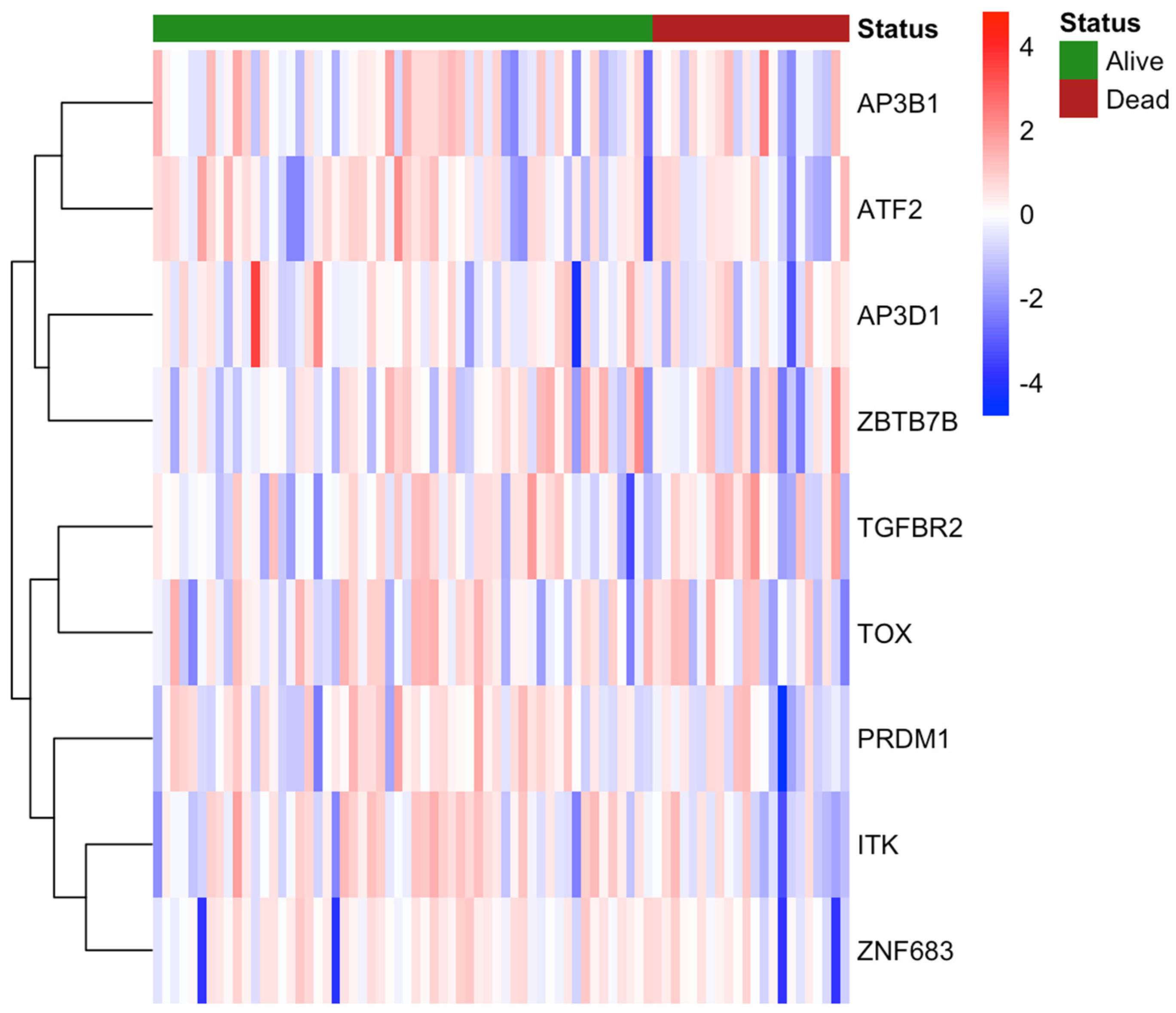 | ZNF683 | 0.66 | 0.17 | −0.49 | 0.71 | −2.80 | 0.02 |