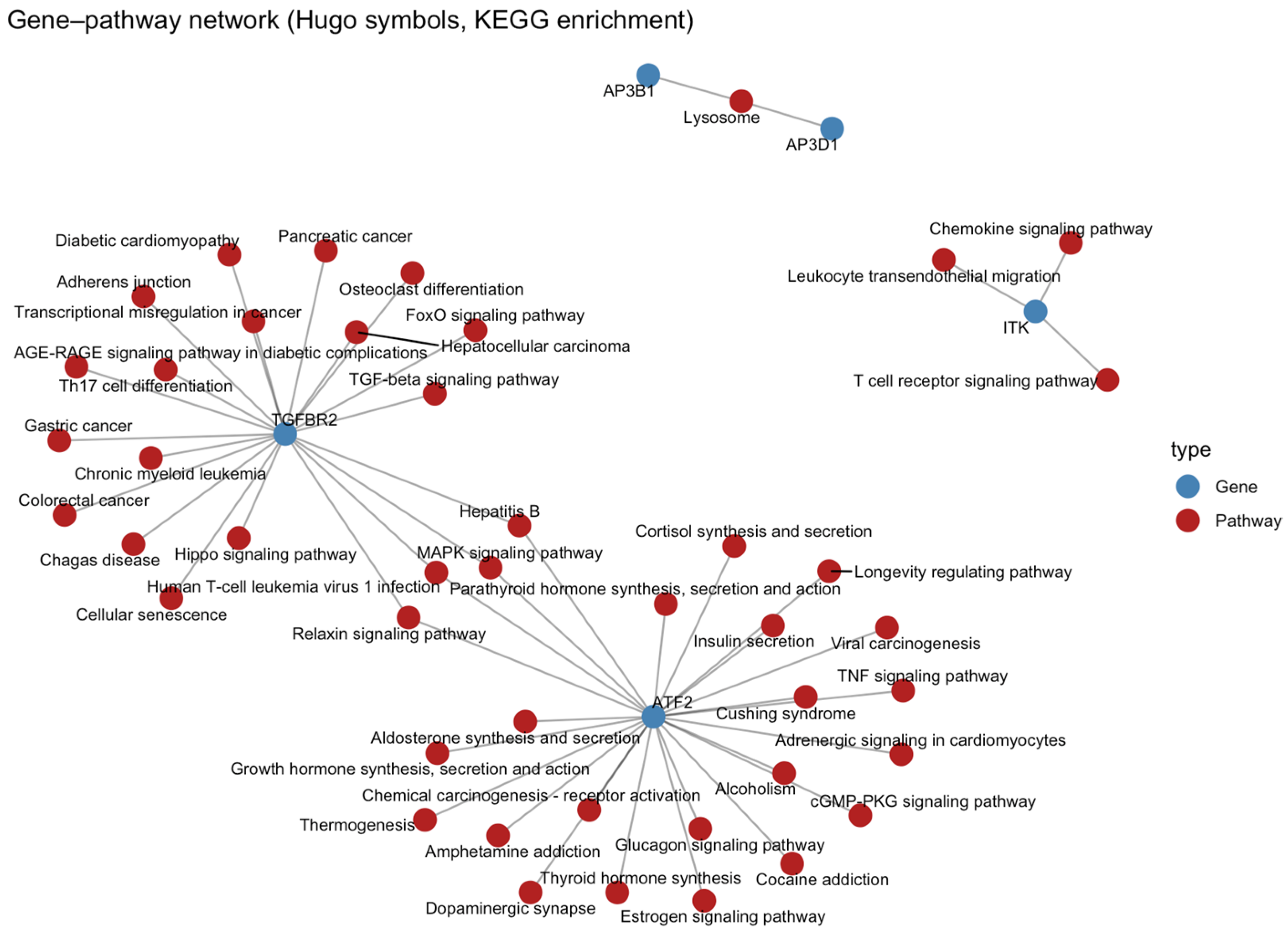 3.6. KEGG Pathway Enrichment and Gene–Pathway Network Analysis