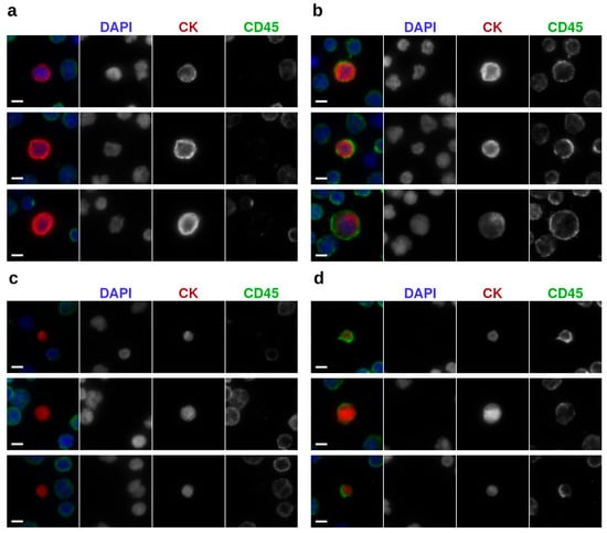 Representative images of tumor events with different phenotypes under 400× magnification: (a) epi.CTCs (b) im.CTCs; (c) epi.LEVs, and (d) im.LEVs. Scale bars: 5 µm.