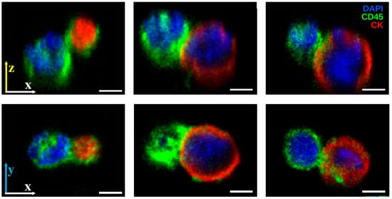 Selected contacting tumor-immune events were further visualized using high-resolution confocal microscopy. The events were located on the slides and imaged via a laser-scanning confocal microscope (Zeiss 880 inverted microscope, Zeiss Corp., Oberkochen, Germany) using a 100× oil-immersion objective. Z-stack optical sectioning was performed at 0.2 µm intervals to resolve the three-dimensional localization of signals relative to CTCs and LEVs. Encapsulation features were defined as partial or asymmetric enrichment of the CD45 signal at the membrane interface between the tumor-derived structure and the contacting WBCs. Image analysis and three-dimensional projection were performed using the ImageJ software package (version 1.54j).