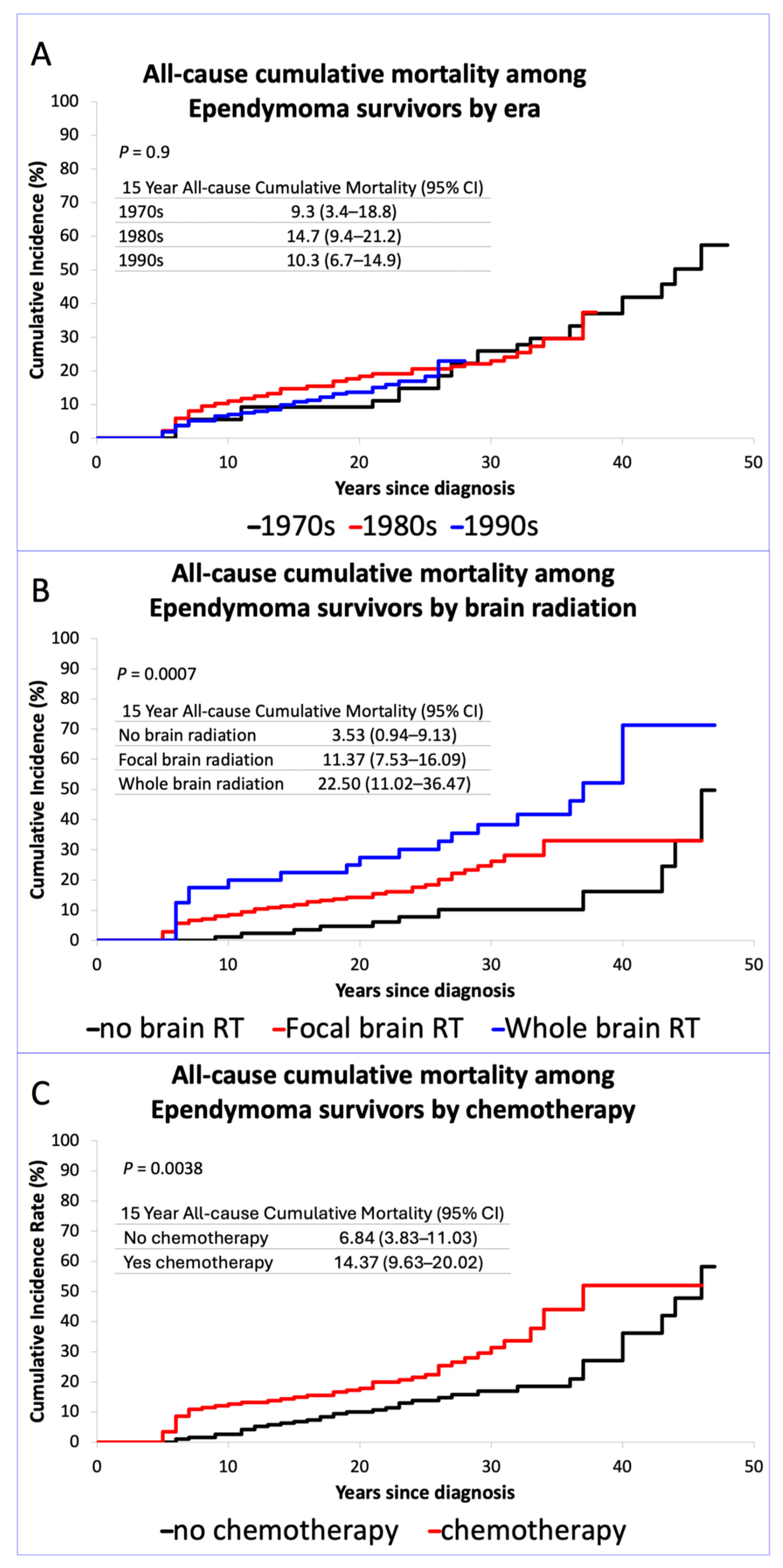Lange KR, de Blank P, Xing M, Mirzaei S, Srivastava DK, Oeffinger K, Neglia J, Krull K, Nathan PC, Howell R, et al. Late Morbidity and Mortality in Survivors of Childhood Ependymoma: A Report from the Childhood Cancer Survivor Study (CCSS). Cancers. 2025; 17(22):3669. https://doi.org/10.3390/cancers17223669