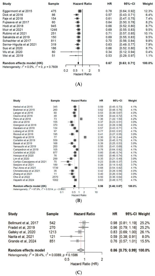 Forest plots for overall survival (OS). Pooled hazard ratios of OS in patients with melanoma [,,,,,,,,,,,,] (A), NSCLC [,,,,,,,,,,,,,,,,,,,,,,,,] (B), and urothelial cancer [,,,,] (C), treated with anti-PD-(L)1 or CTLA-4 antibodies. CI, confidence interval; HR, hazard ratio.