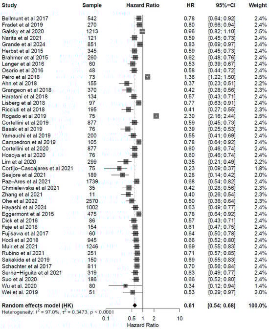Forest plot for overall survival (OS) including all studies analyzed [,,,,,,,,,,,,,,,,,,,,,,,,,,,,,,,,,,,,,,,,,]. The pooled HR was 0.60 (95% CI: 0.54–0.67; p < 0.001), indicating a 40% reduction in the risk of death. Moderate heterogeneity was observed (I2 = 84.6%).