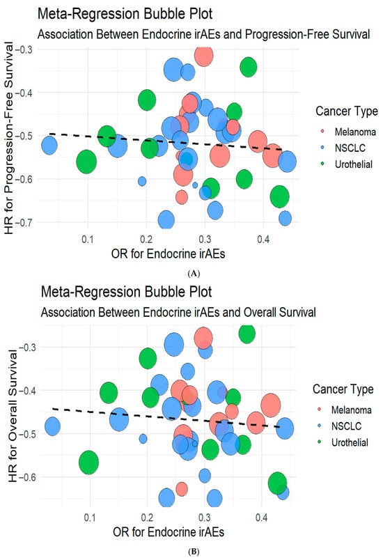 Meta-regression bubble plots illustrating the association between endocrine irAEs with progression-free survival (A) and overall survival (B). The size of the bubbles represents study weight, while color coding indicates cancer type. No significant linear correlation was observed between endocrine irAE incidence and survival benefit (PFS estimate = 0.20, 95% CI −0.10 to 0.51, p = 0.19; OS estimate = 0.14, p > 0.05), suggesting independent mechanisms underlying efficacy and toxicity.