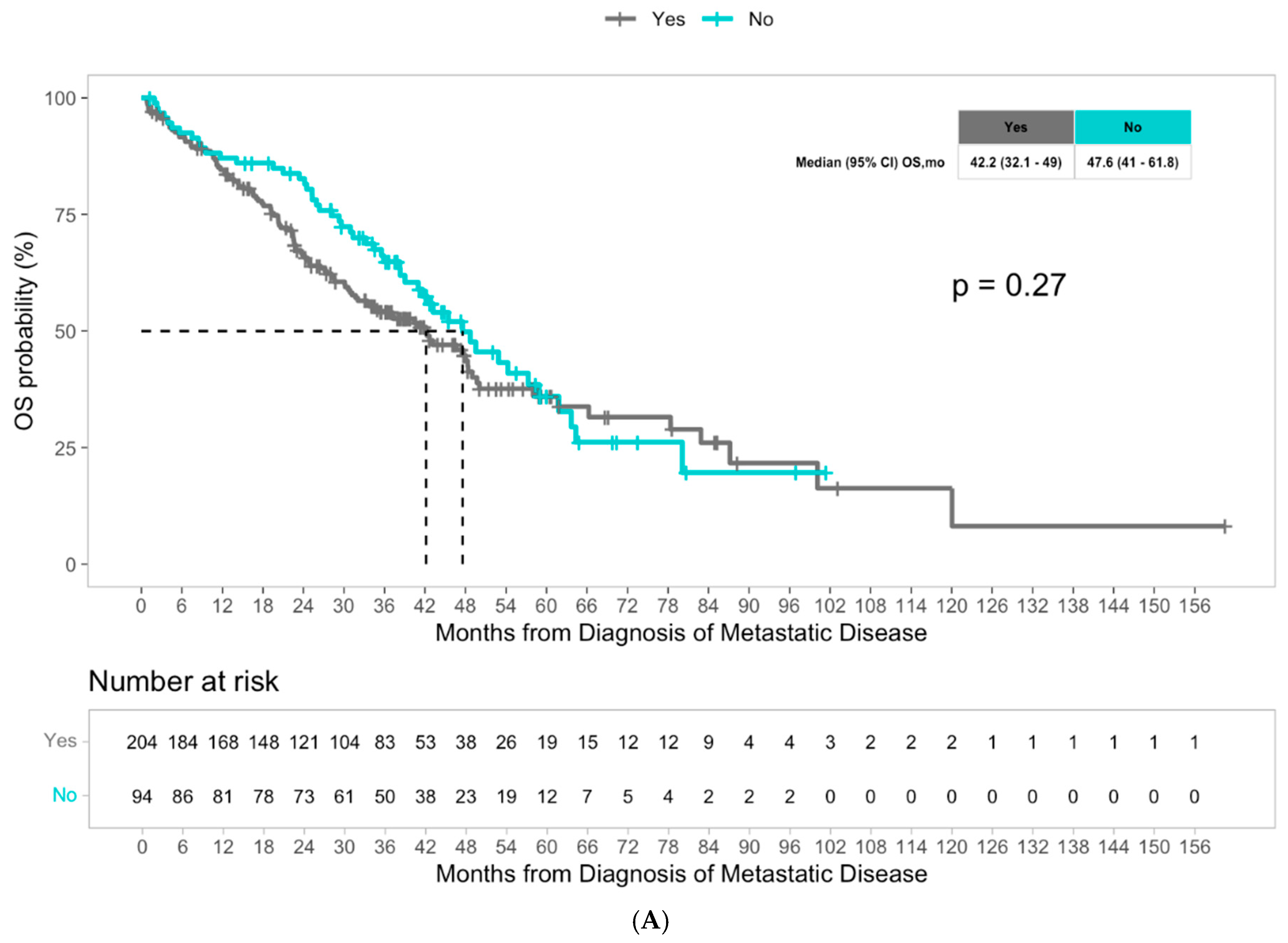 Survival analyses focused on individuals with metastatic colorectal cancer. Overall survival (OS) was defined as the time from metastatic disease to death from any cause. Time to next treatment was defined as the time between first-line and second-line systemic treatment. Patients who lost their clinical follow-up were censored according to their last contact date. Kaplan–Meier curves were used to estimate OS, and the log-rank test was used for group comparisons. Multivariable Cox proportional hazards regression was used to evaluate associations between OS and clinical variables, including site of metastasis and molecular alterations. Hazard ratios (HRs), 95% confidence intervals (CIs), and two-sided p-values were reported accordingly. Comparisons between groups were performed using the chi-square or Fisher’s exact test for categorical variables and the Mann–Whitney U test for continuous variables.