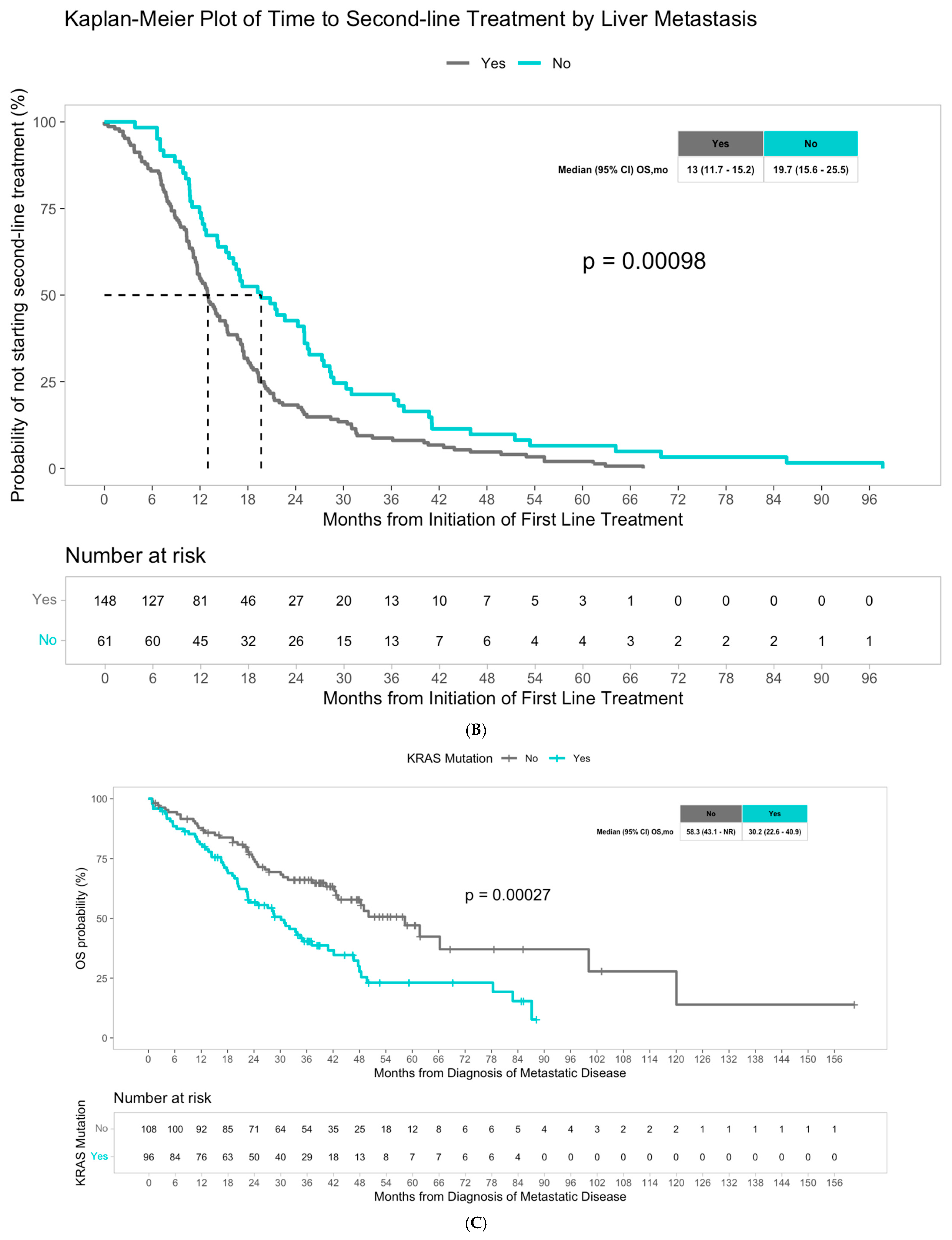 Figure 1. (A) Median overall survival in patients with advanced CRC with liver metastasis versus non-liver metastasis. (B) Median time from first-line to second-line treatment in patients with advanced CRC with liver metastasis versus non-liver metastasis. (C) Median overall survival in patients with advanced CRC with liver metastasis with KRAS mutations versus without KRAS mutations. (D) Overall median survival in patients with advanced CRC without liver metastasis with BRAF mutations versus without BRAF mutations.