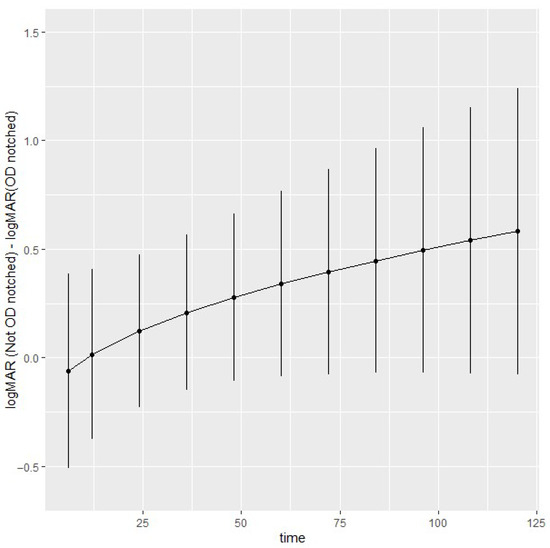 To explore the longitudinal effects of optic disc notch on logMAR, contrasts were estimated and are shown in Figure 2 with 95% simultaneous confidence intervals. At 10 years, the logMAR difference without and with optic disc notch is 0.58 [−0.077, 1.2]. Overall, there is some evidence of a trend of higher logMAR without optic disc notch compared to optic disc notch; however, the small number of observations in later years produces wider confidence intervals. The contrasts reflect the expected trends in Figure A2, available in Appendix A.