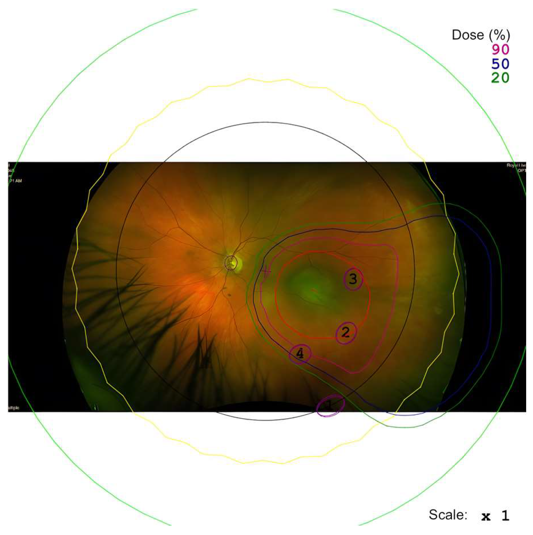 - Oellers, P.; Mowery, Y.M.; Perez, B.A.; Stinnett, S.; Mettu, P.; Vajzovic, L.; Light, K.; Steffey, B.A.; Cai, J.; Dutton, J.J.; et al. Efficacy and Safety of Low-Dose Iodine Plaque Brachytherapy for Juxtapapillary Choroidal Melanoma. Am. J. Ophthalmol. 2018, 186, 32–40. [Google Scholar] [CrossRef] [PubMed]