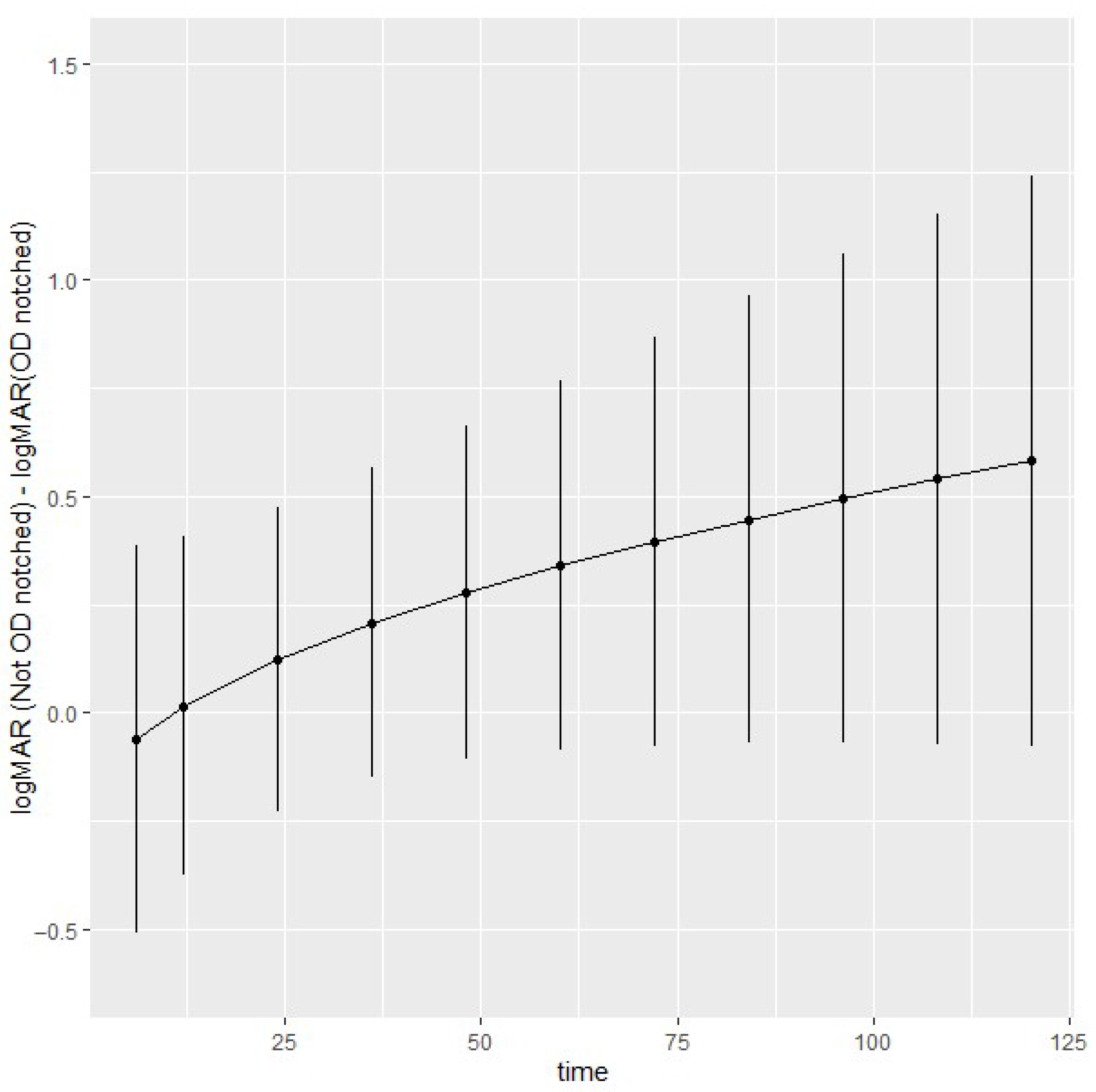 Figure 2 with 95% simultaneous confidence intervals. At 10 years, the logMAR difference without and with optic disc notch is 0.58 [−0.077, 1.2]. Overall, there is some evidence of a trend of higher logMAR without optic disc notch compared to optic disc notch; however, the small number of observations in later years produces wider confidence intervals. The contrasts reflect the expected trends in
