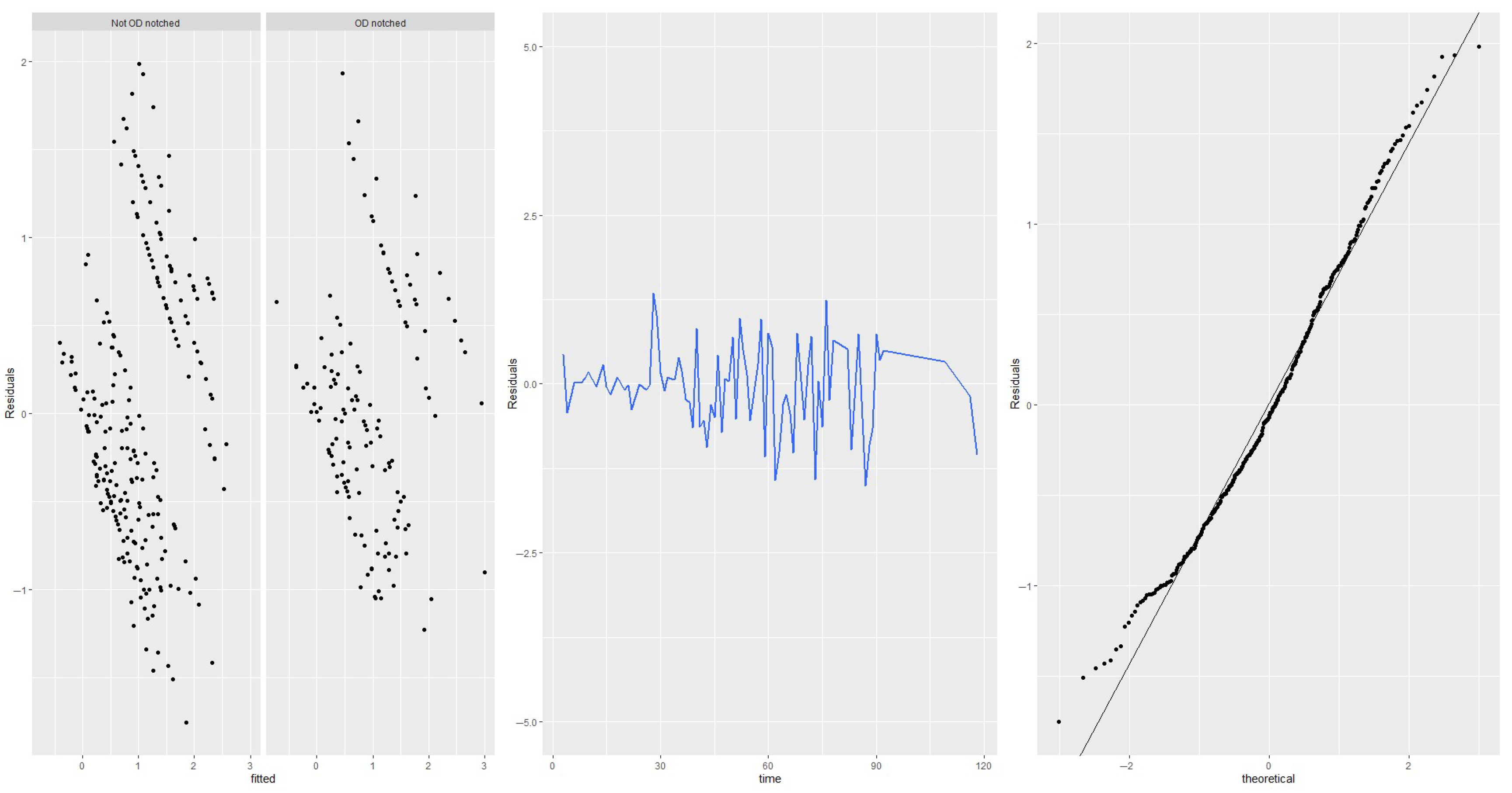 Figure A1 we plotted, from left to right: the prediction residuals by fitted values (stratified by notch); the prediction residuals by time; and the distribution of residuals vs. the theoretical distribution. No alarming patterns are evident in any of the plots.