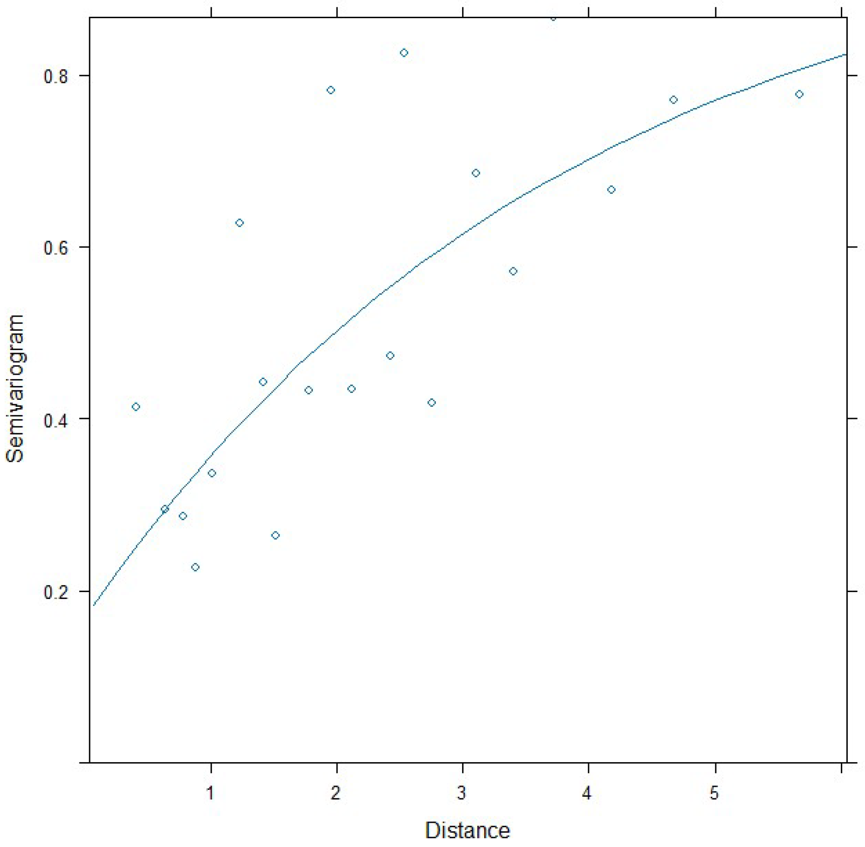 Figure A2 the correlation and variance structures are validated by estimating the semivariogram. The empirical variogram is largely in agreement with the pattern indicated by the exponential correlation and heteroscedastic variance.