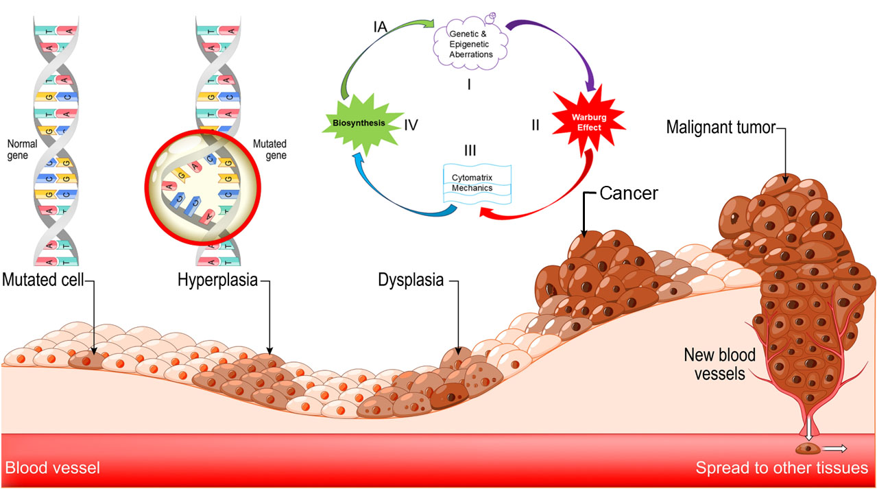 These physical and chemical processes are accompanied by observable morphological changes, including variations in cell size (mass) and shape, adaptation in energy sources, involving aerobic glycolysis, enhanced cytomatrix mechanics characterized by increased cytoplasmic fluctuations, and increased biosynthesis evidenced by nucleolar hypertrophy. The cancer cycle, starting with benign tumors, includes the accumulation of mutations resulting in heterogeneity and a precancerous state that progresses to neoplasm formation. If any of the four necessary conditions for tumor development are absent, tumor progression and growth may slow down.