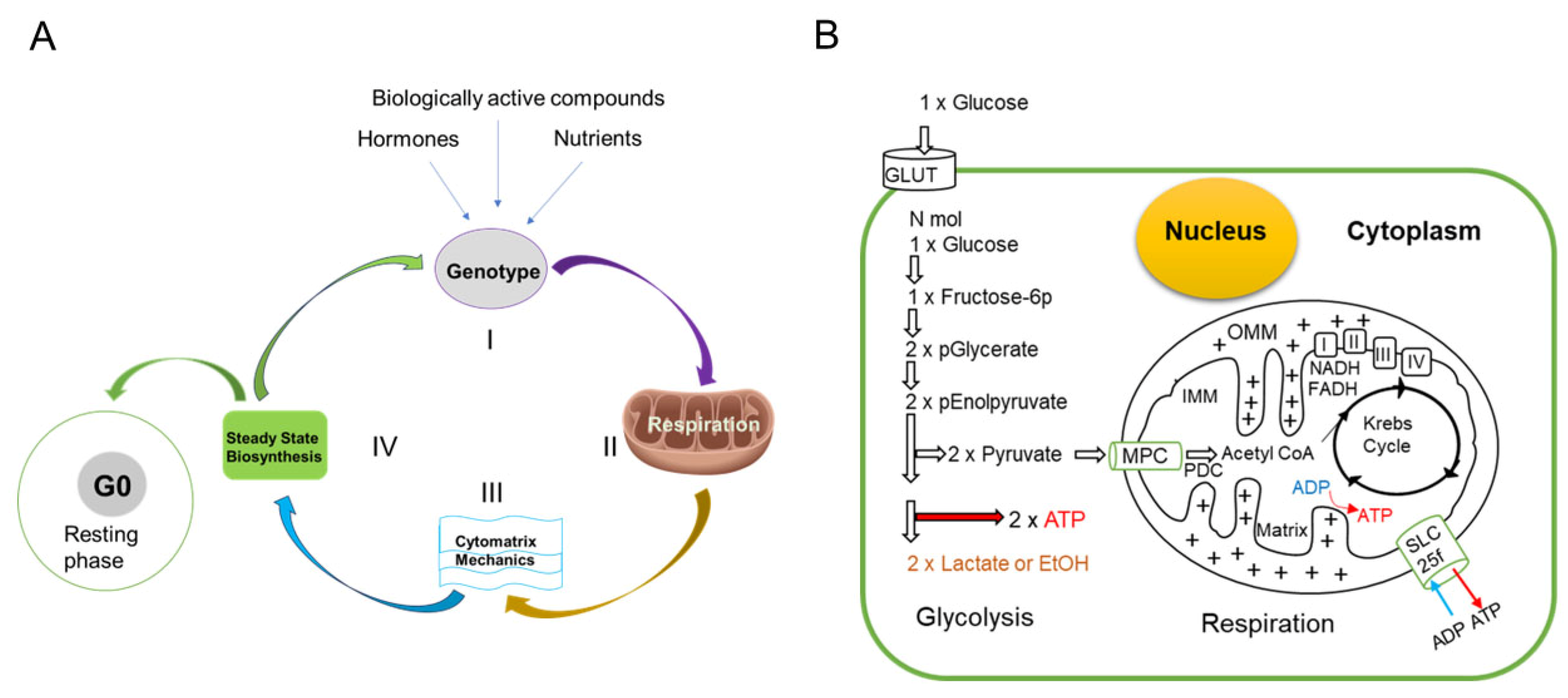Gene expression, which is governed by external signals, determines the shape, size, and function of cells through chemical processes occurring in the cytoplasm. The cytomatrix, the solid phase of cytoplasm, is dynamic and requires an energy input to maintain the cell’s specific shape and function. In healthy cells, mitochondrial oxidative phosphorylation supplies the energy required to support cytomatrix mechanics, which regulate steady-state synthetic processes and metabolism (