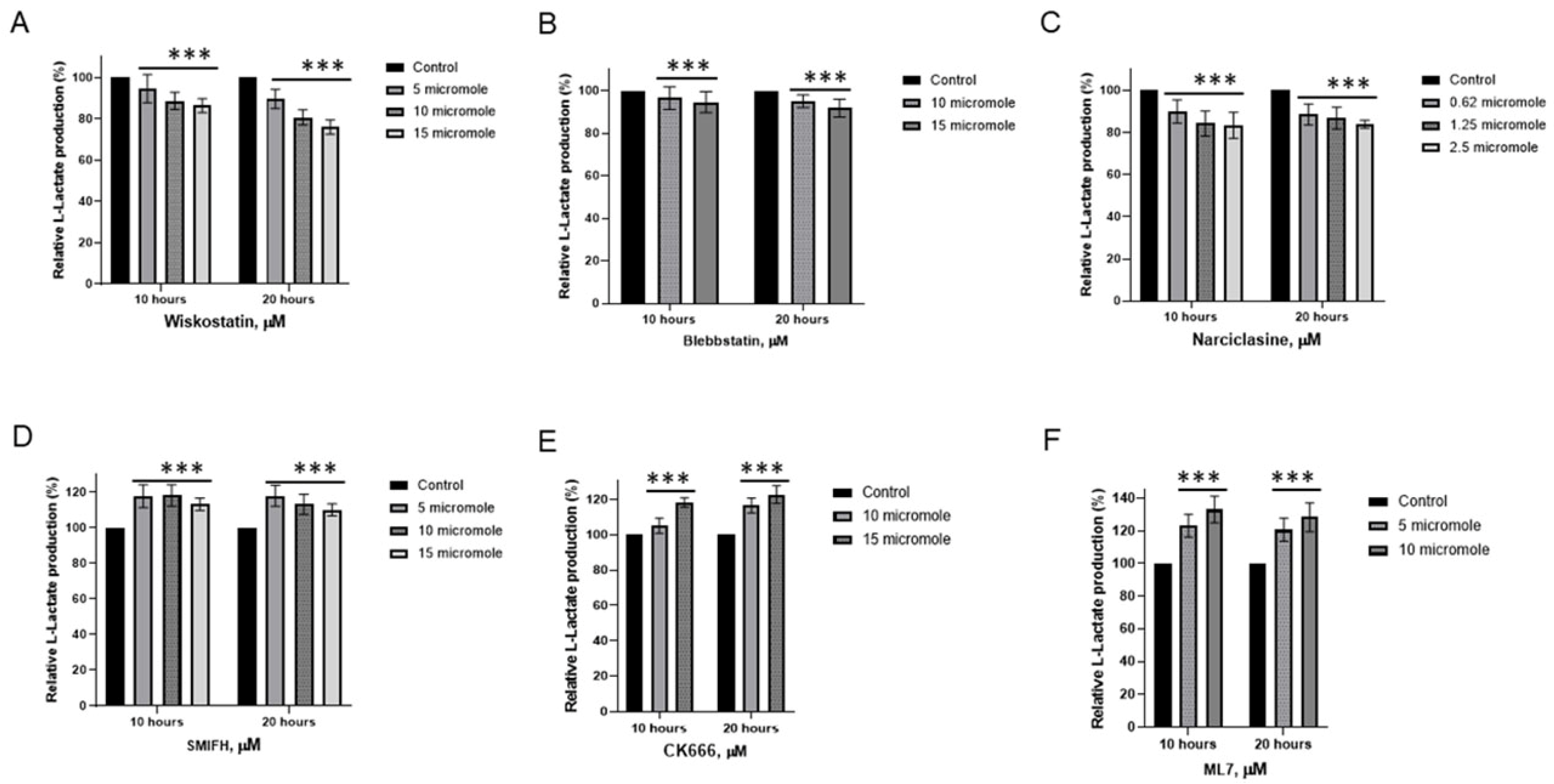 Wiskostatin, Blebbistatin, and Narciclasine exhibited varying degrees of suppression in lactic acid production (