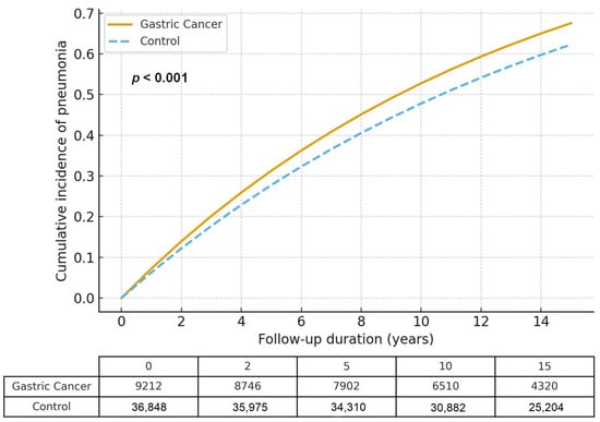 Cumulative incidence of pneumonia in gastric cancer patients and matched controls, estimated using the Fine–Gray subdistribution hazard model accounting for death as a competing event. The cumulative incidence of pneumonia remained higher in the gastric cancer group throughout the follow-up period.