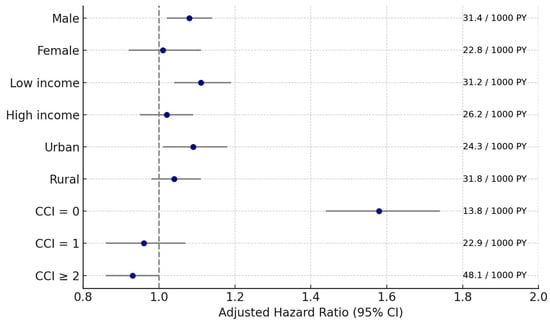 Subgroup analyses using overlap weighting–adjusted models demonstrated that the risk of pneumonia was significantly higher in GC patients than in controls across several population strata. The association was particularly evident among men (adjusted HR 1.08; 95% CI: 1.02–1.14; p = 0.006), low-income individuals (adjusted HR 1.11; 95% CI: 1.04–1.19; p = 0.003), urban residents (adjusted HR 1.09; 95% CI: 1.01–1.18; p = 0.023), and notably, participants without comorbidities (CCI = 0; adjusted HR 1.58; 95% CI: 1.44–1.74; p < 0.001).