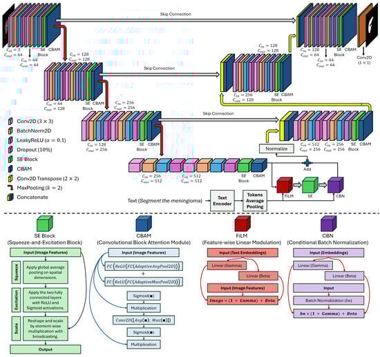 The decoder reconstructs a high-resolution segmentation mask from the fused, text-conditioned feature map and the preserved skip connections , which contain high-resolution, low-level details critical for precise boundary delineation. It consists of three upsampling blocks, each containing a transposed convolution (deconvolution) to double the spatial resolution, subsequently concatenated with the associated skip connection from the encoder. Then, a residual double convolutional block is augmented with both SE and CBAM attention mechanisms. This architecture ensures that high-frequency structural details lost during downsampling are recovered through the skip connections, while the attention mechanisms ensure that the reconstruction focuses on the most relevant regions. Let denote the feature map at the l-th decoder stage, with . The first upsampling step is where is a transposed convolution with a kernel and stride 2, doubling the resolution to . This is concatenated with the corresponding skip connection , using Equation (16). The concatenated features are then processed by a double convolutional block with attention using Equation (17).