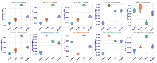 Violin distribution of Dice, IoU, and F1 scores across all testing instances for each loss function applied on the Brain Tumor MRI Dataset.