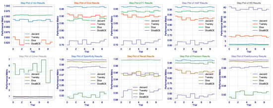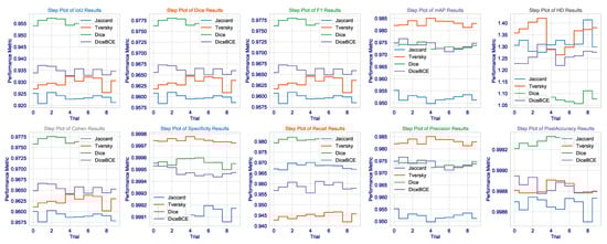 Step distribution of the Dice, IoU, and F1 scores across all testing instances for each loss function applied on the Brain Tumor MRI dataset.