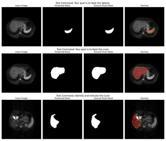Studies by Zbinden et al. [], Hossain et al. [], and Ciausu et al. [] targeting liver or kidney-specific segmentation with traditional deep networks did not resort to natural language prompting or dynamic cross-modal fusion. While these publications have claimed to achieve good results for their tasks, they are limited to applications involving a single organ and a single modality and hence are not adaptable to different clinical queries. On the contrary, our method was shown to generalize better for segmentation over different organs and modalities, yielding an average Dice coefficient of 0.9640 with a low standard deviation of (±0.0022), along with a significantly low Hausdorff Distance (HD = 1.6706 ± 0.1243), demonstrating an accurate boundary delineation. Ciausu et al. [] reported low scores for left kidney segmentation (Dice: 0.68 ± 0.31), thus highlighting the intricate nature of segmenting anatomically variant organs, which is a limitation our model bypasses by virtue of its adaptive text-guided fusion mechanism. This comparison proves that our architecture is at least at par, if not better than, specialized models, while offering a new dimension of flexibility via interaction through natural language.