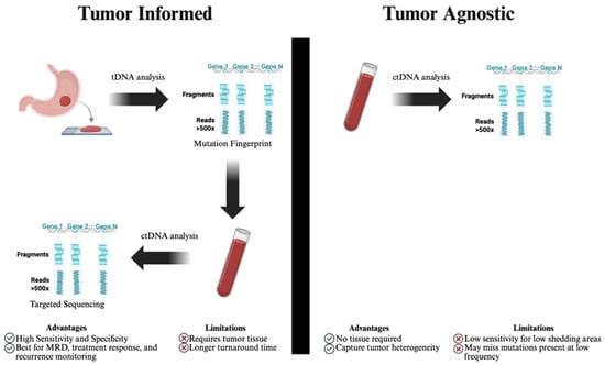 There are two general approaches to quantifying ctDNA, tumor-informed (targeted) and tumor-agnostic (untargeted) (Figure 1). The tumor-informed approach requires prior knowledge of the specific mutations or alterations contained within the tumor, which necessitates a tissue biopsy. This approach has repeatedly shown higher sensitivity and specificity and is therefore appropriate to assess for MRD, evaluate treatment response, and monitor early recurrence [,,]. The tumor-agnostic approach, on the other hand, does not require prior tumor knowledge, which makes it cost-effective and accessible, especially when tumor tissue is unavailable. It enables the comprehensive characterization of the molecular landscape of the tumor and facilitates monitoring acquired mutations and resistance mechanisms, making it ideal to capture intratumor heterogeneity [,]. Importantly, tumor-agnostic tests have the benefit of faster turn-around times; however, they do come at the cost of lower sensitivity and requiring high concentrations of ctDNA []. Ultimately, the appropriate approach should be selected based on the clinical context. Figure 1 compares tumor-informed and tumor-agnostic ctDNA testing approaches.