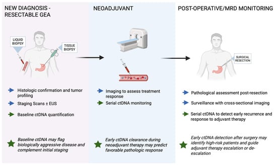Recurrence after curative surgery remains the principal hurdle to durable survival in GEA. Contemporary peri-operative trials still show significant risk of recurrence often at a stage no longer amenable to salvage therapy [,,,,,]. Conventional surveillance with cross-sectional computed tomography (CT) ± carcinoembryonic antigen (CEA) and carbohydrate antigen 19-9 (CA19-9) misses sub-clinical disease, often attributed to imaging requiring a macroscopic tumor volume and serum markers lacking sensitivity [,]. ctDNA offers a biologically grounded alternative: fragments released from dying tumor clones are measurable in plasma within hours, so their persistence or re-emergence after treatment signals molecular residual disease, sometimes months before radiology []. Figure 2 summarizes the potential clinical workflow and timing of ctDNA assessment across the diagnostic, neoadjuvant, and postoperative settings in resectable GEA.