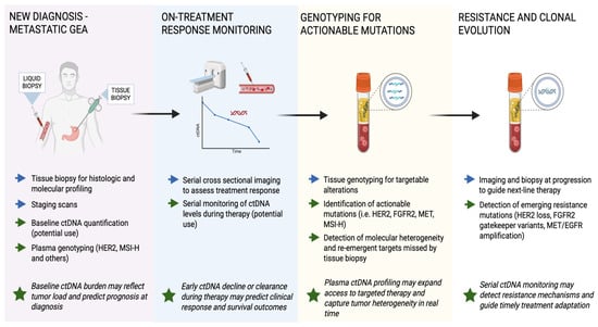 Similarly to the early-stage setting, multiple studies have shown the prognostic utility of ctDNA in metastatic GEA patients. In the prospective LIQUID BIO study, investigators enrolled 72 patients with metastatic GEA and used a tumor-informed amplicon NGS assay that tracked up to 48 patient specific single nucleotide variants []. ctDNA was detectable in 75% of cases, and patients with two or more tracked mutations at baseline had considerably worse outcomes, with median progression-free survival (PFS) of 4.5 months vs. 9.2 months (p-value = 0.009) and OS of 8.4 months vs. 16.5 months (p-value = 0.014). Meanwhile, real-world data from the GuardantINFORM registry, which included 824 US patients with advanced gastric cancer profiled via the tumor-agnostic Guardant360 hybrid-capture NGS assay (73 genes), showed that a baseline maximum variant allele frequency (VAF) > 2.9% predicted an earlier need for therapy change (4.8 vs. 7.4 months, p-value < 0.001) and shorter OS (13.2 vs. 19.1 months, p-value < 0.001) even after adjusting for standard clinical factors such as Eastern Cooperative Oncology Group (ECOG) status and metastatic burden []. A meta-analysis of 22 ctDNA studies, predominantly using tumor-agnostic ddPCR or ≤50 gene NGS panels in 1144 metastatic GEA, found that ctDNA positivity at baseline carried a pooled HR for death of 3.87 []. Despite methodological differences, these studies consistently demonstrate that higher ctDNA burden at diagnosis is associated with poorer prognosis in metastatic GEA. Figure 3 illustrates how ctDNA is integrated across the disease course in metastatic GEA, from diagnosis and treatment monitoring to detection of actionable mutations and resistance mechanisms.