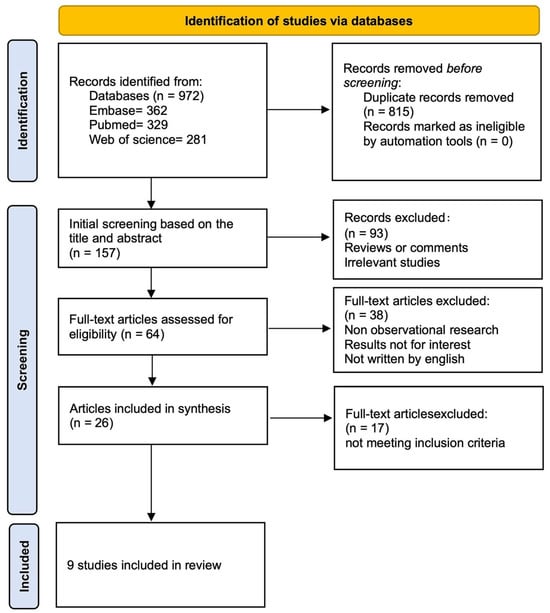 A total of 972 studies were identified through database searches up to January 2025. After removing duplicates, 157 records remained for screening. Of these, 93 were excluded based on study type. Full-text assessment of the remaining 64 articles led to the exclusion of 55 that did not meet the eligibility criteria. Ultimately, 9 studies were included in the review, comprising 3 prospective and 6 retrospective studies.