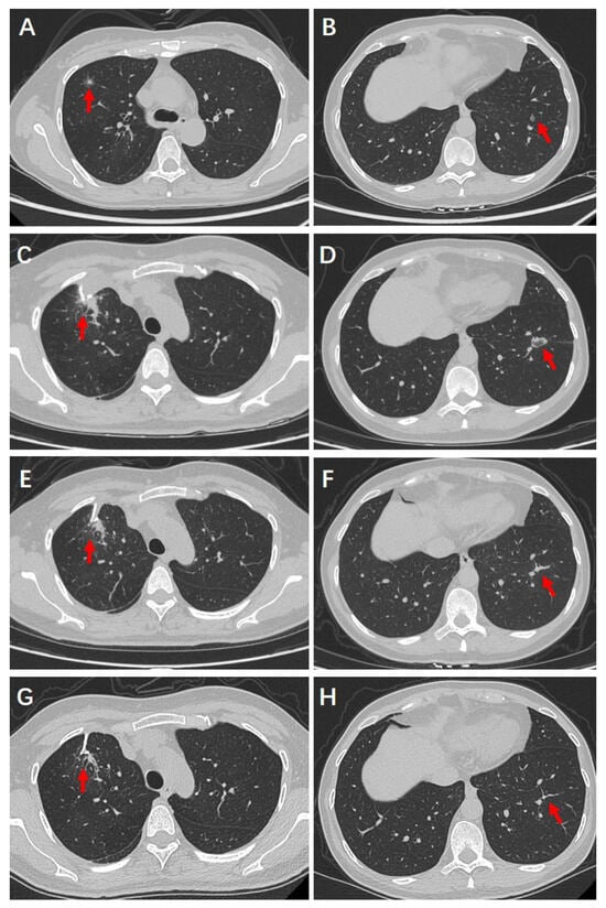 Pre-and postoperative High-Resolution Computed Tomography images of contralateral lesions managed by surgical resection and radiofrequency ablation. The primary part (right upper lobe)-solid nodule with spiculated margins underwent resection, while the contralateral lesion (left lower lobe) was ablated. Follow-up demonstrated progressive shrinkage and fibrosis of the lesions. (A) Resected lesion, preoperative. (B) Ablated lesion, preoperative. (C) One month after resection. (D) One month after ablation. (E) Three months after resection. (F) Three months after ablation. (G) Six months after resection. (H) Six months after ablation. The arrows indicate the location of the lesions and the changes observed during postoperative follow-up.