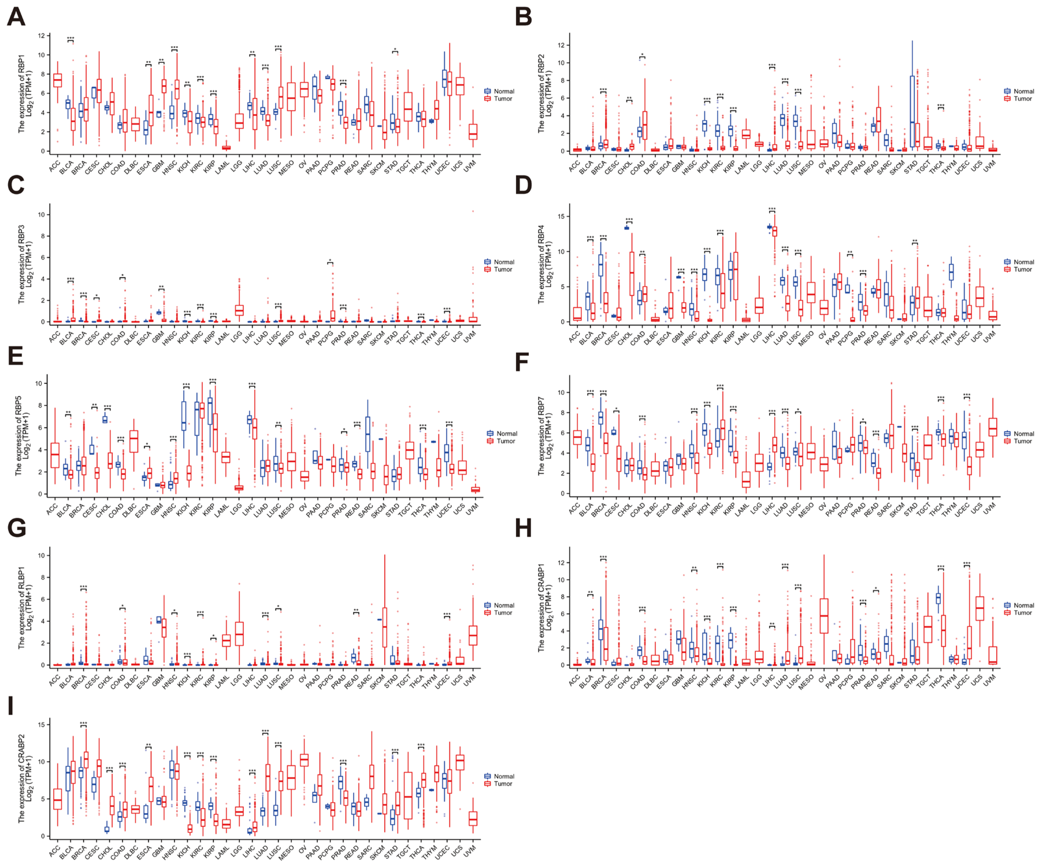 3.2. Expression Levels of the RBP Family in Pan-Cancer