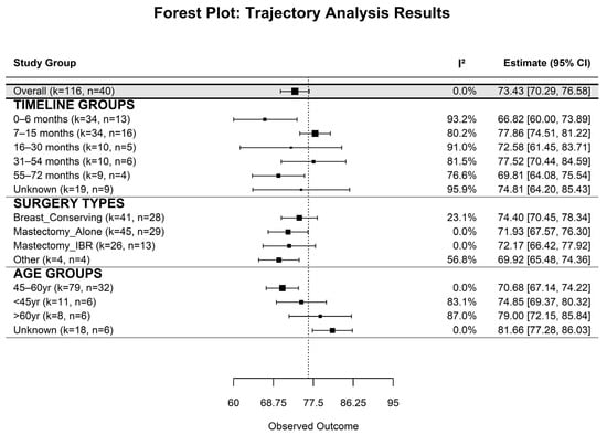 The pooled analysis revealed significant variations in EF among BC survivors following surgery, influenced by time since surgery, surgical modality, and age group. The overall pooled estimate for EF was 73.44 (SE = 1.61, 95% CI: 70.29–76.58, p < 0.001), with no between-study heterogeneity (I2 = 0%) (Table A1, Figure 1 and Figure A2). Time since surgery significantly influenced QoL: scores were lowest during the initial 6 months (66.82, 95% CI: 59.75–73.89, I2 = 93.2%), peaked at 7–15 months (77.86, 95% CI: 74.51–81.22, I2 = 80.2%) and 31–54 months (77.52, 95% CI: 70.44–84.59, I2 = 81.5%), and showed lower values at 16–30 months (72.58, 95% CI: 61.45–83.72, I2 = 91.0%) and 55–72 months (69.81, 95% CI: 64.08–75.54, I2 = 76.6%). Variability remained high across most timepoints.